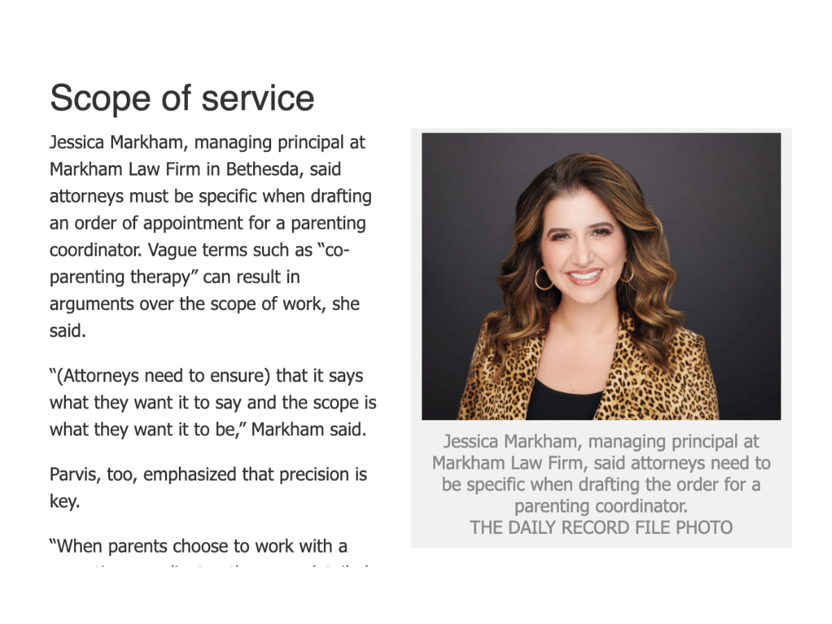 Jessica Markham, managing principal at Markham Law Firm in Bethesda, said attorneys must be specific when drafting an order of appointment for a parenting coordinator. Vague terms such as “co-parenting therapy” can result in arguments over the scope of work, she said.